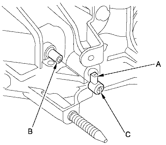 28. Install two new O-rings (A) on the 10.9 x 18.6 mm CVTF feed pipe (B), then install it on the manual valve body (C).