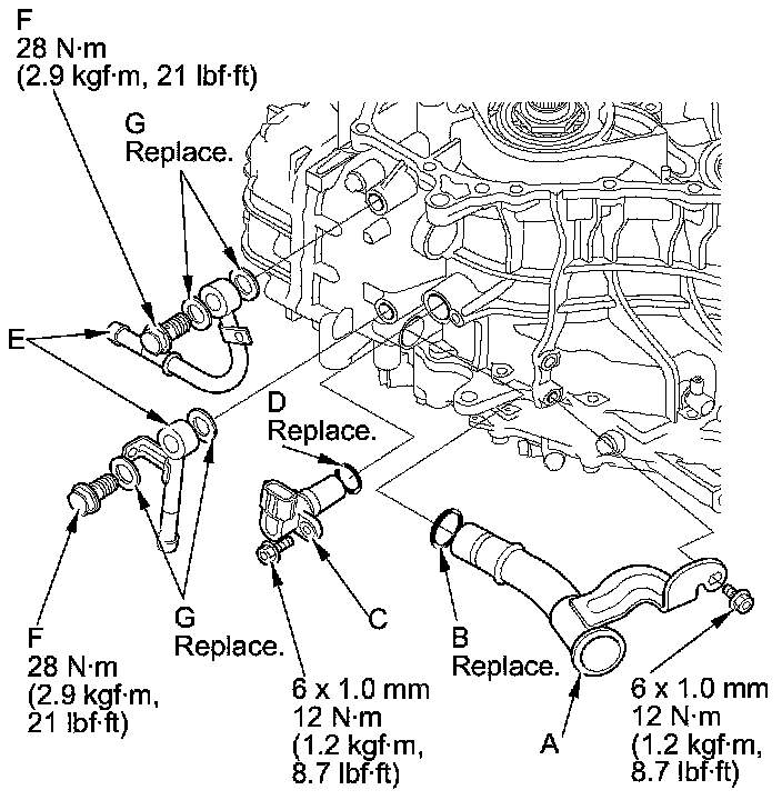 79. Install the two CVTF cooler lines (E) with the line bolts (F) and new sealing washers (G).