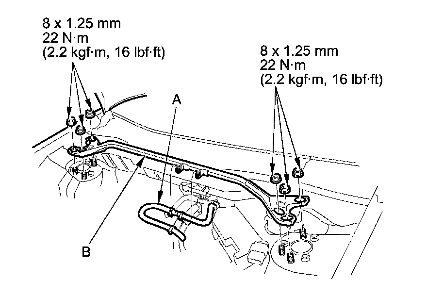2. Disconnect the brake booster vacuum hose (A) from the strut brace (B).