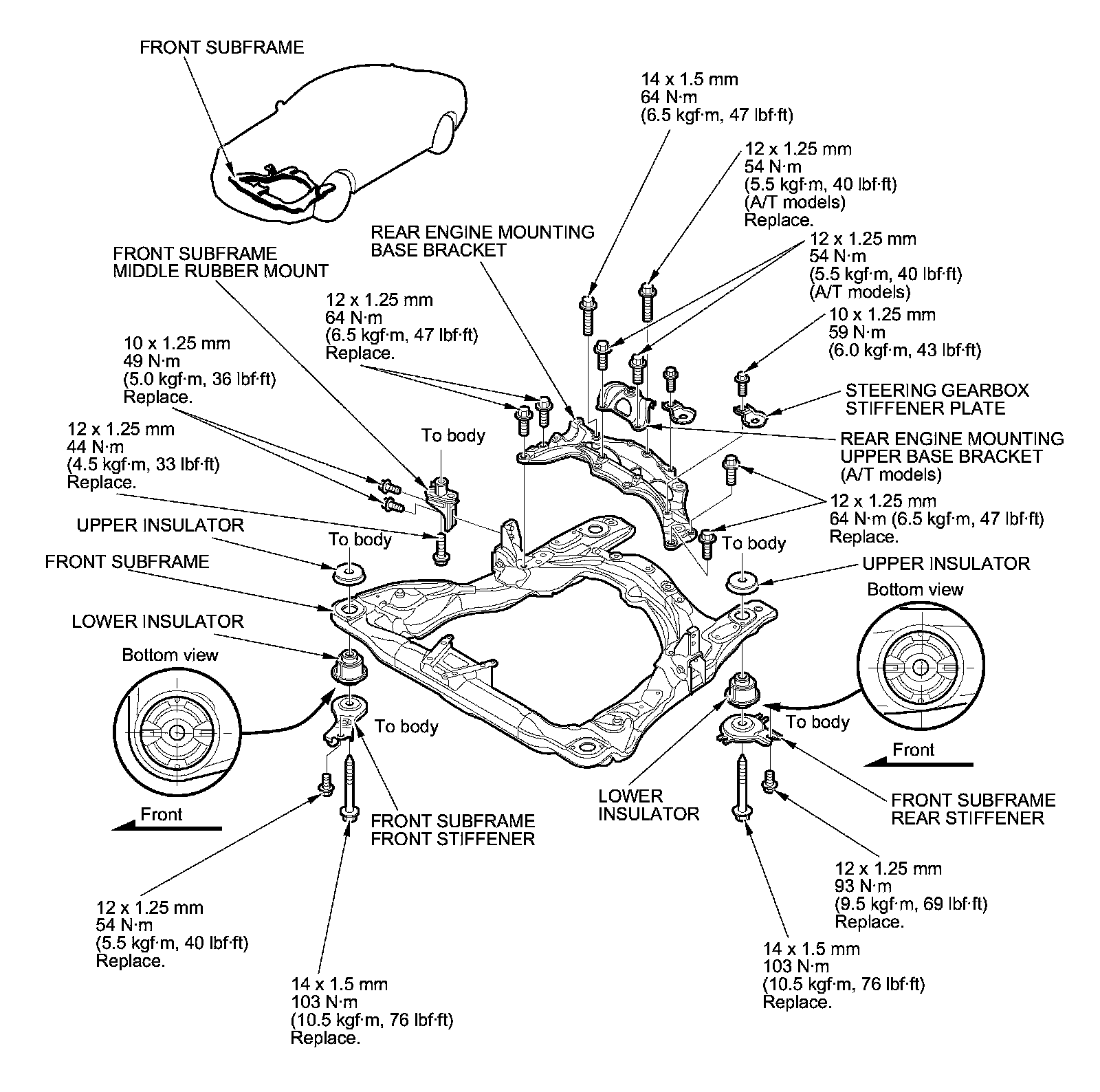 After removing the subframe mounting bolts, the front subframe middle rubber mount mounting bolts, the front subframe rear stiffener mounting bolts, the rear engine mounting base bracket mounting bolts, the rear engine mounting upper base bracket mounting bolts be sure to replace them with new ones.
