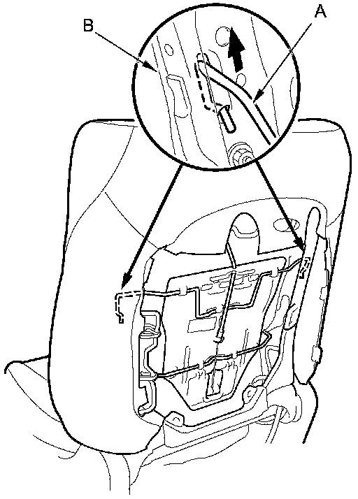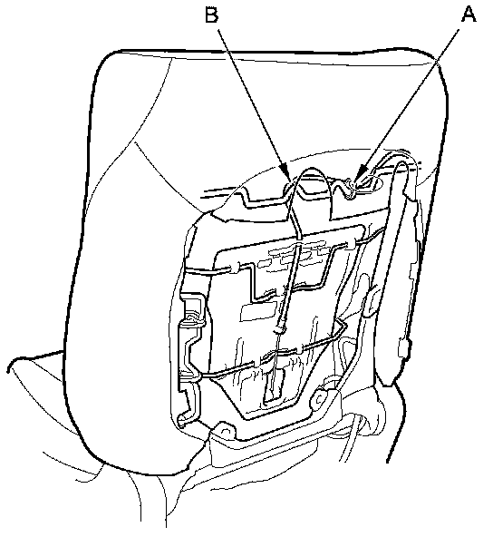 6. Release the lower wire (A) from both active head restraint links (B) inside the seat-back.