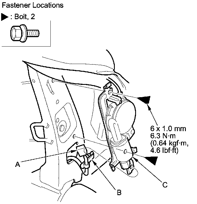 8. Disconnect the lumbar support motor connector (A), and detach the harness clip (B). Remove the bolts, and separate the lumbar support motor (C) from the frame, then remove the lumbar support.