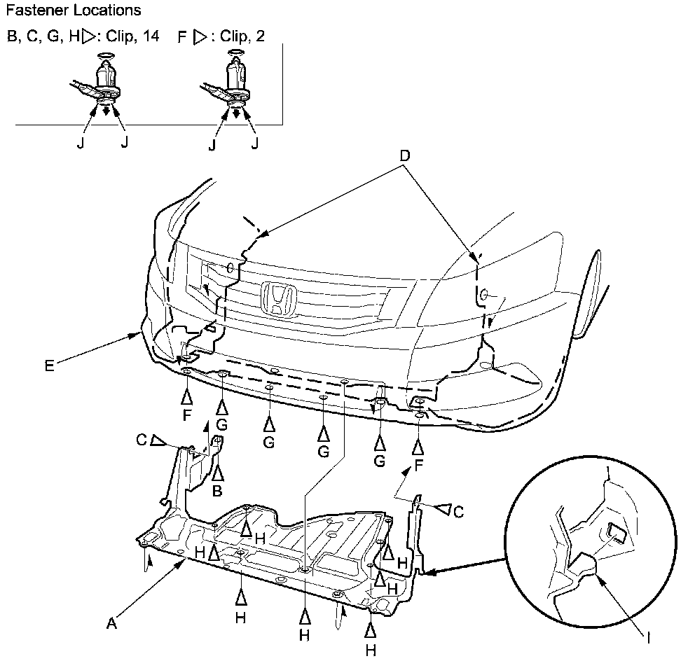 NOTE: To release the clips, pry up on the center pin at the notch (J).