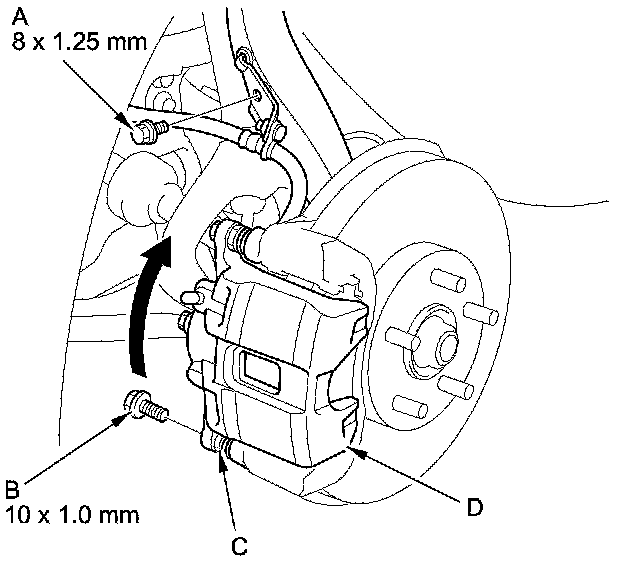 4. Remove the flange bolt (B) while holding the caliper pin (C) with a wrench. Be careful not to damage the pin boot, and pivot the caliper body (D) up out of the way. Check the hose and pin boots for damage and deterioration.