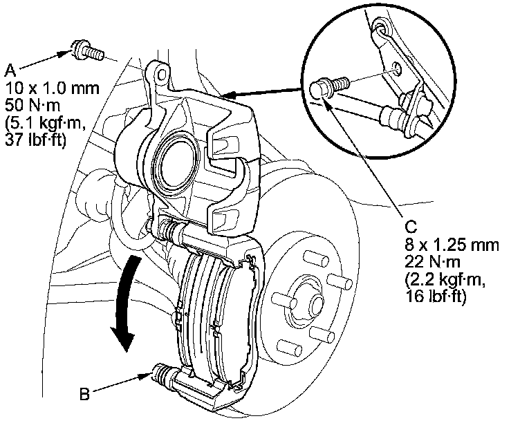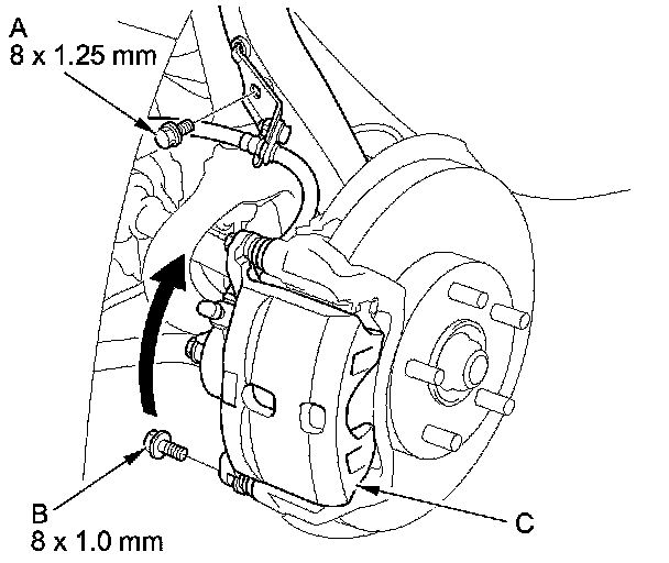 5. Remove the flange bolt (B), and pivot the caliper body (C) up out of the way. Check the hose and the pin boots for damage and deterioration.