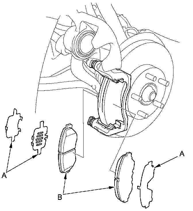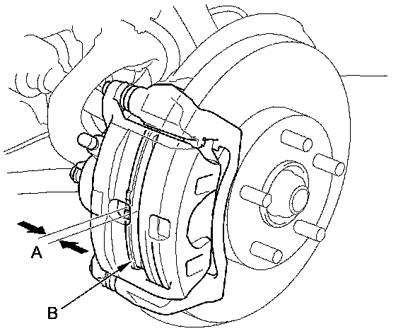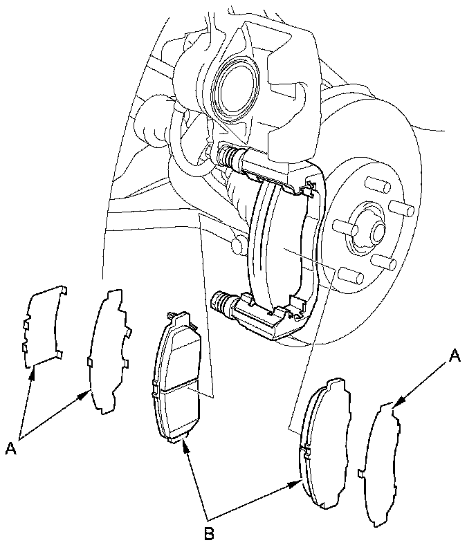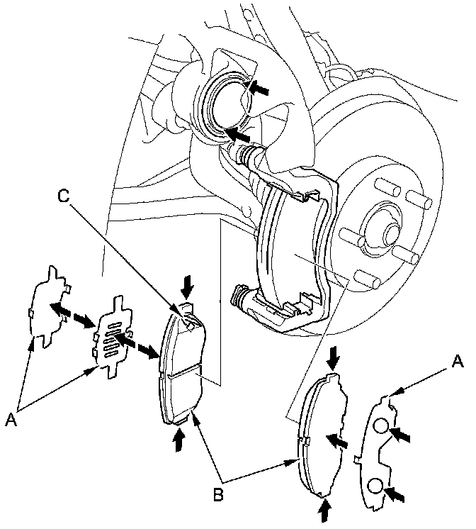 5. Check the thickness (A) of the inner pad (B) and the outer pad (C). Do not include the thickness of the backing plate.