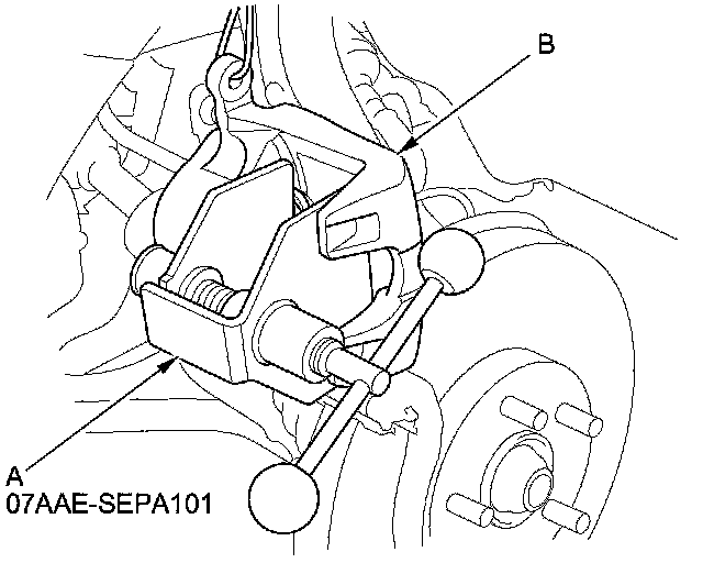 13. Install the brake caliper piston compressor tool (A) on the caliper body (B).