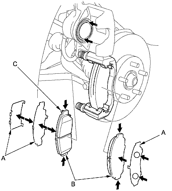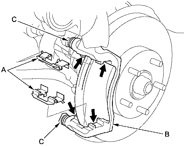 17. Install the brake pads and the pad shims correctly. Install the brake pad with the wear indicator (C) on the upper inside position. If you are reusing the brake pads, always reinstall the brake pads in their original positions to prevent a temporary loss of braking efficiency.
