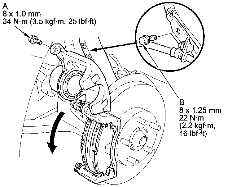 7. Pivot the caliper body down into position. Install the flange bolt (A), and tighten it to the specified torque while holding the caliper pin (B) with a wrench being careful not to damage the pin boot.