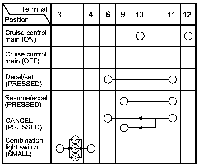 3. Check for continuity between the terminals in each cruise control combination switch position according to the table.