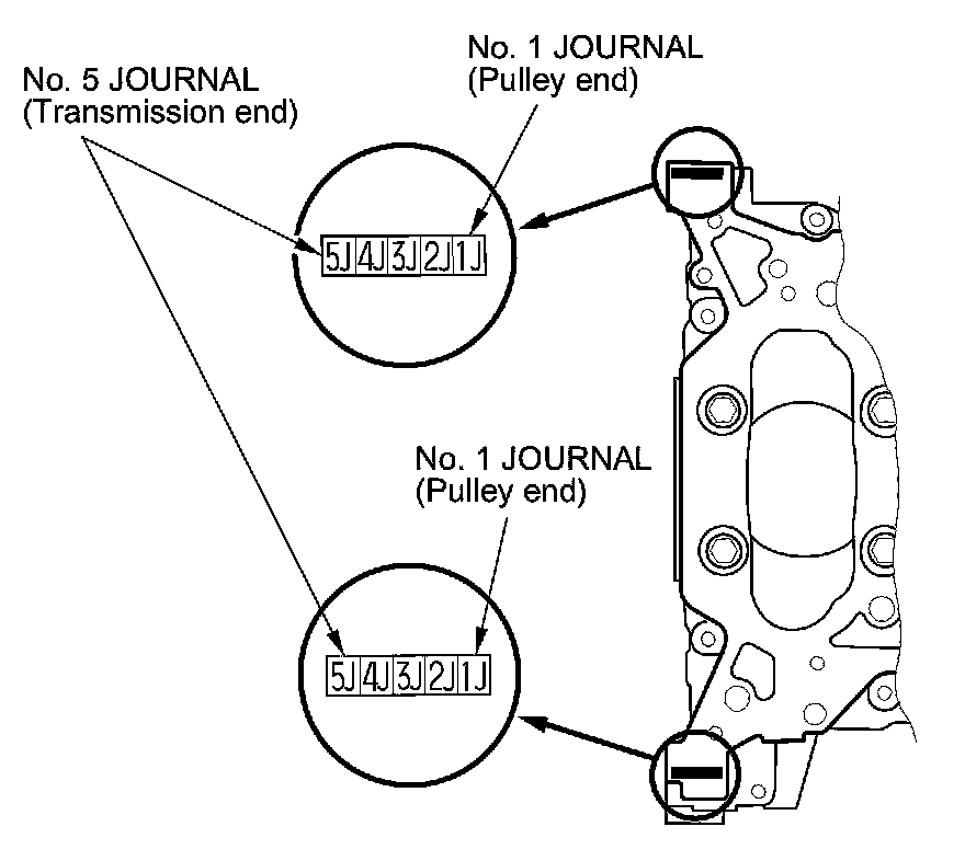 1. Numbers, letters, or bars have been stamped on either side of the lower block end as a code for the size of each of the five main journal bores. Write down the block bore codes.