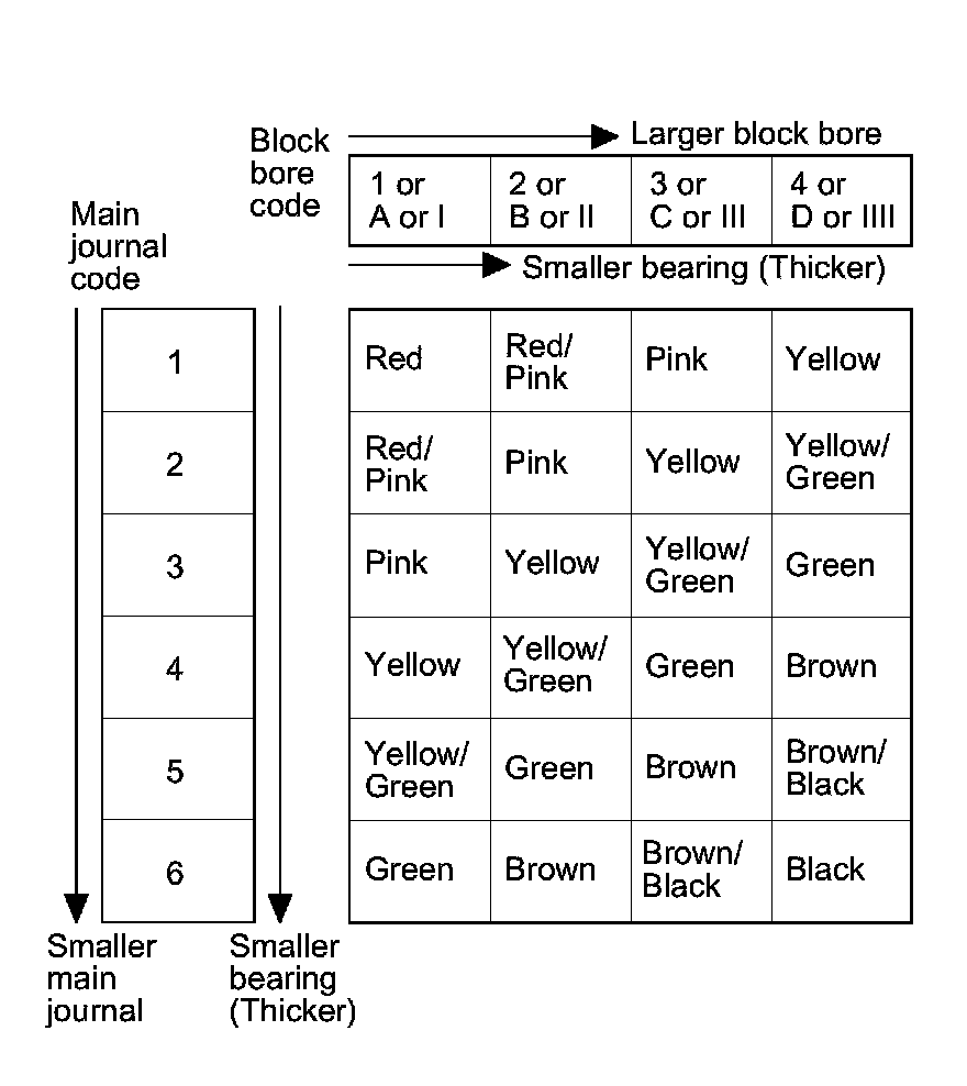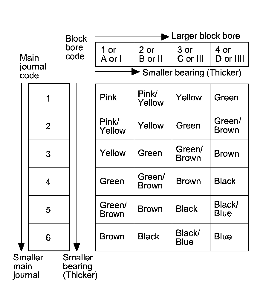 3. Use the block bore codes and the main journal codes to select the appropriate replacement bearings from the following table.