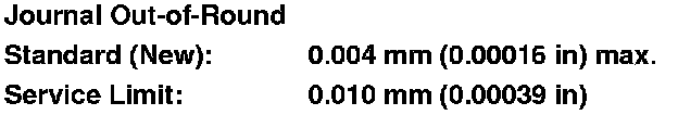 5. Measure the out-of-round at the middle of each rod and main journal in two places. The difference between measurements on each journal must not be more than the service limit.