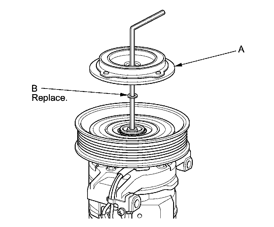 3. If you are replacing the field coil, remove the snap ring (A) with snap ring pliers, then remove the pulley (B). Be careful not to damage the pulley or the A/C compressor.