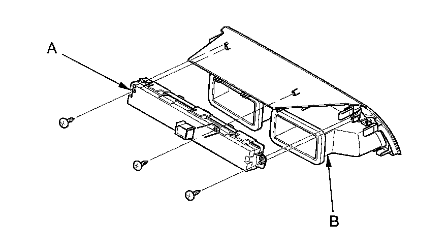 2. Remove the self-tapping screws and the audio-HVAC subdisplay unit (A) from the dashboard center vent (B).
