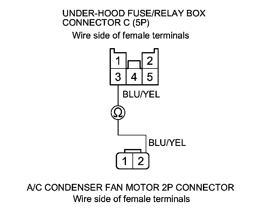 5. Check for continuity between under-hood fuse/relay box connector C (5P) terminal No. 3 and A/C condenser fan motor 2P connector terminal No. 2.