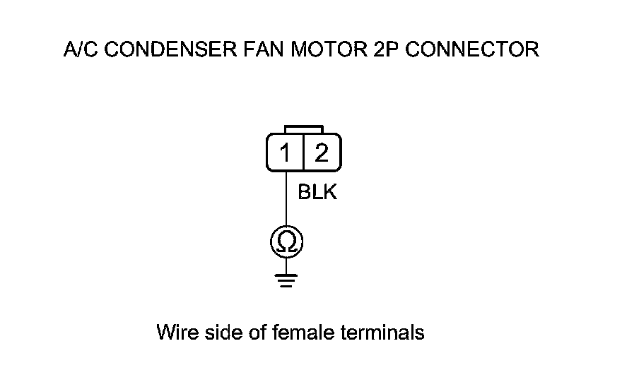 6. Check for continuity between A/C condenser fan motor 2P connector terminal No. 1 and body ground.