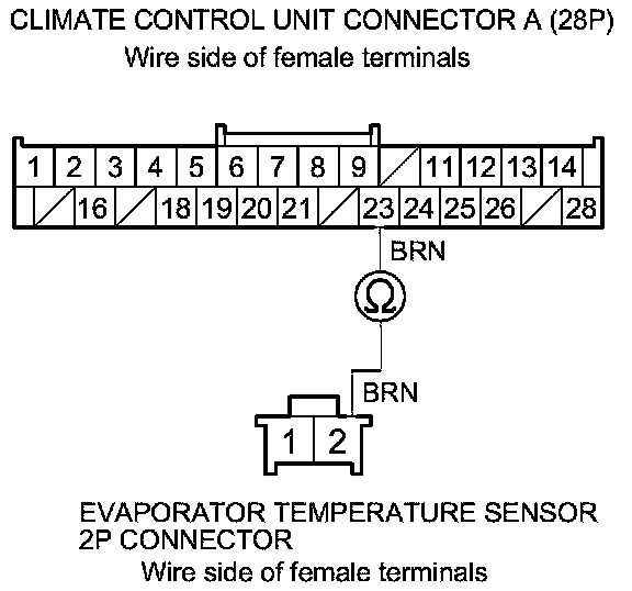 13. Check for continuity between climate control unit connector A (28P) terminal No. 23 and evaporator temperature sensor 2P connector terminal No. 2.
