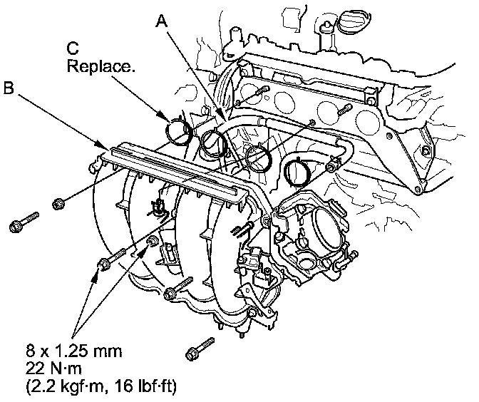 (B) with new gaskets (C), and tighten the bolts and nuts in a crisscross pattern in three steps, beginning with the inner bolt.