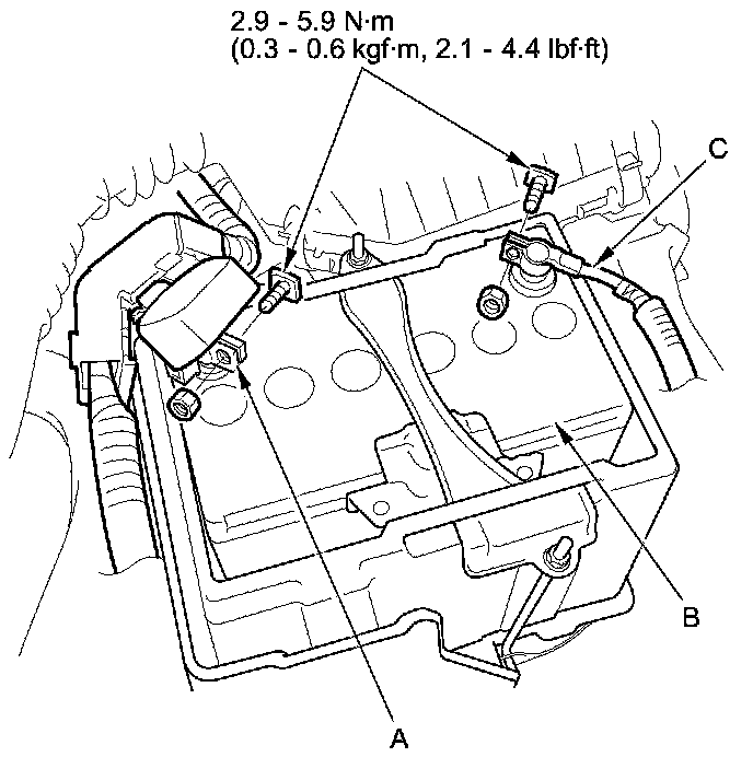 3. Reconnect the positive cable (A) to the battery (B) first, then reconnect the negative cable (C) to the battery.