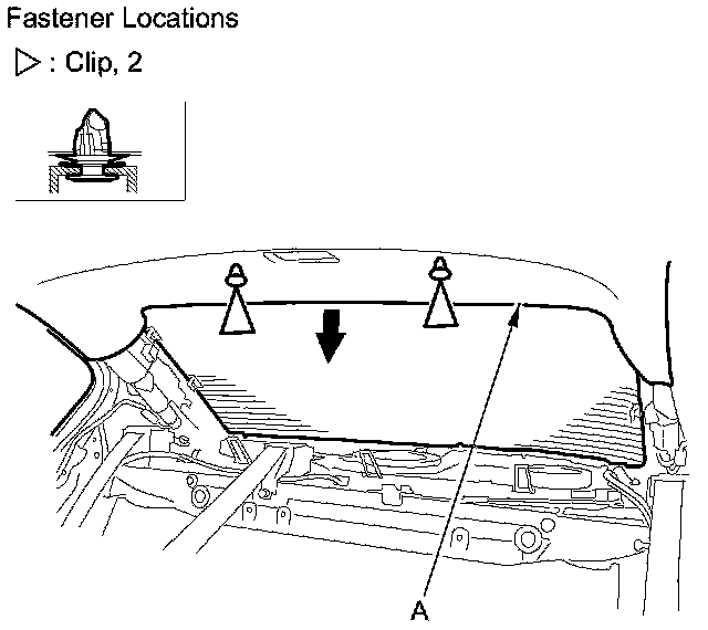 4. Pull down the rear area of the headliner (A) by detaching the clips. 4-door is shown; 2-door is similar.