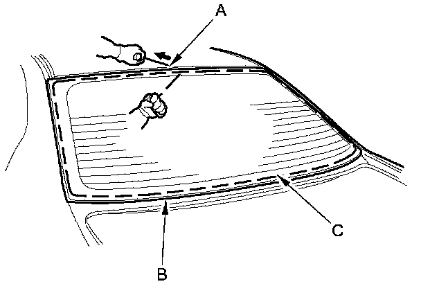 7. With a helper on the outside, pull the piano wire (A) back and forth in a sawing motion. Hold the piano wire as close to the rear window (B) as possible to prevent damage to the body, and carefully cut through the adhesive (C) around the entire rear window. 4-door is shown; 2-door is similar.