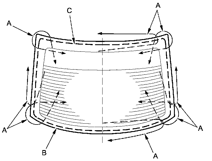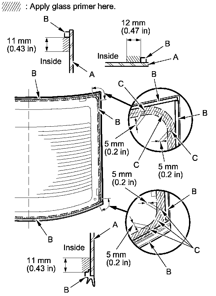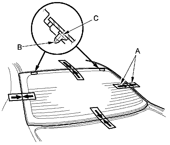 12. Apply glass primer to the edge of the rear window (A) where the lower rubber dam (B) will be attached as shown. Attach the lower rubber dam with adhesive tape (C) to the lower edge of the rear window: