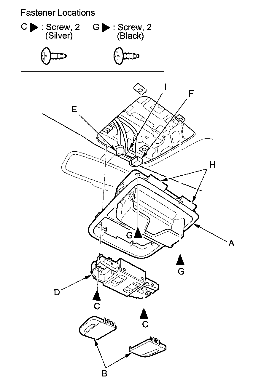 2. Remove the screws (C), then pull out the front individual map light (D).