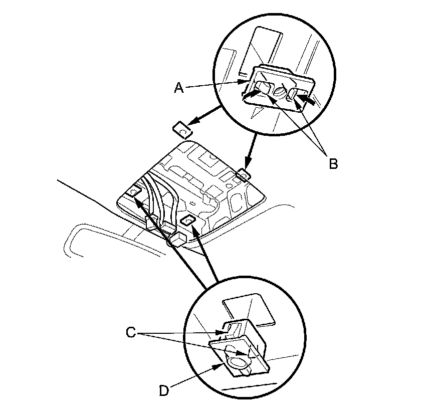7. If necessary, release the hooks (C) by prying out the map light clip (D), then remove the clip.