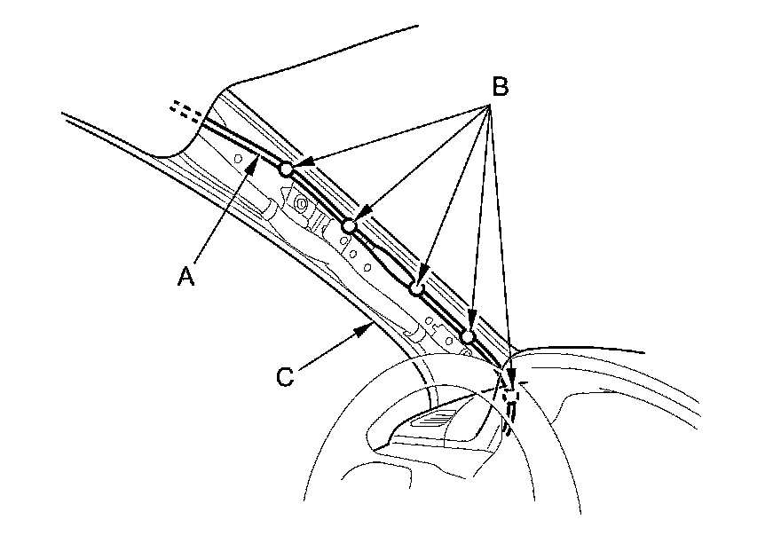9. Remove the antenna lead (A) by detaching the harness clips (B) from the passenger's side A-pillar (C).