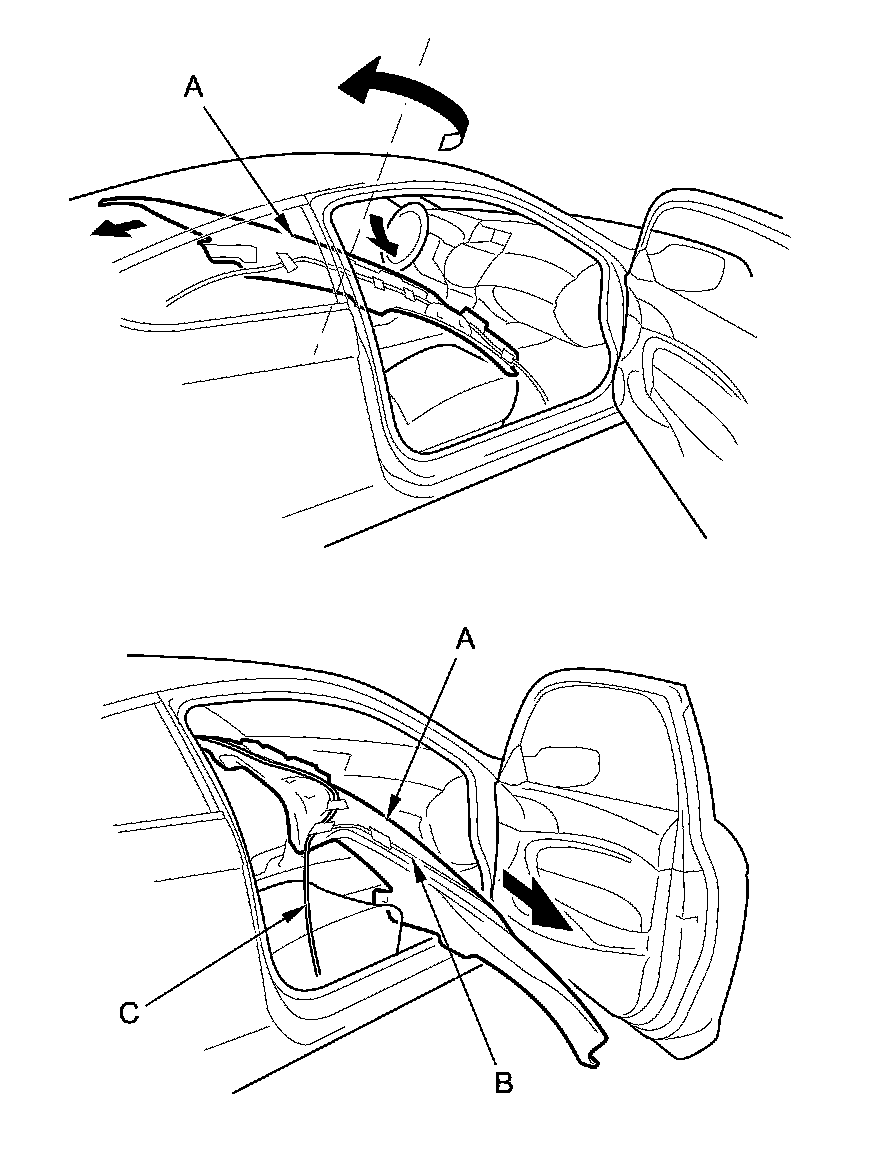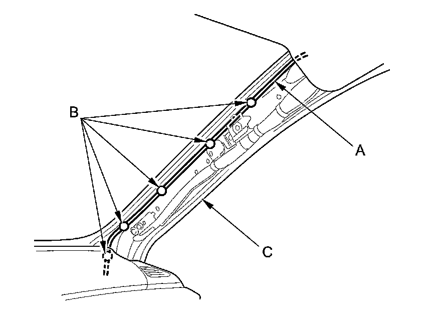 1. Remove the front door opening seals (B) and the rear door opening seals (C) from each roof area.
