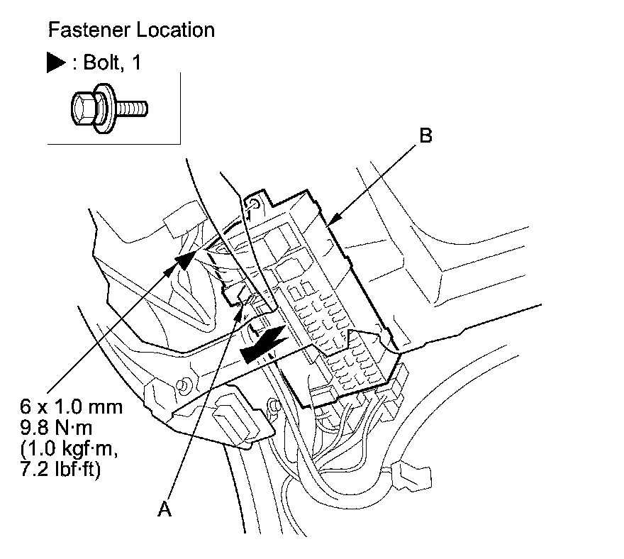 10. From under the driver's dash, remove the driver's under-dash fuse/relay box mounting bolt, and release the hook (A), then lower the driver's under-dash fuse/relay box (B).