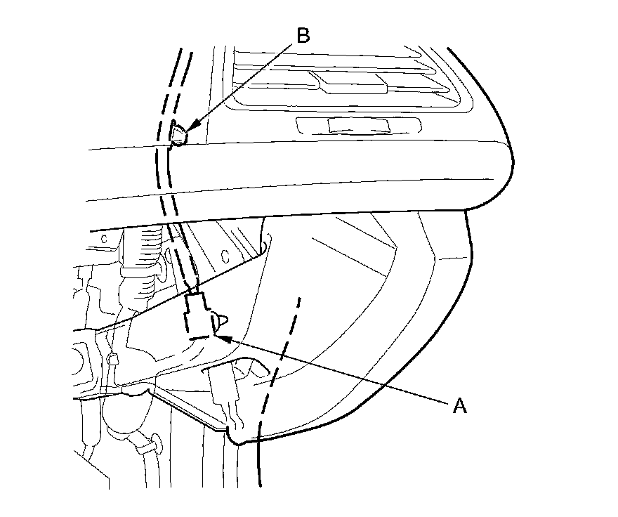 12. From under the passenger's dash, disconnect and detach the antenna lead connector (A), and detach the harness clip (B).