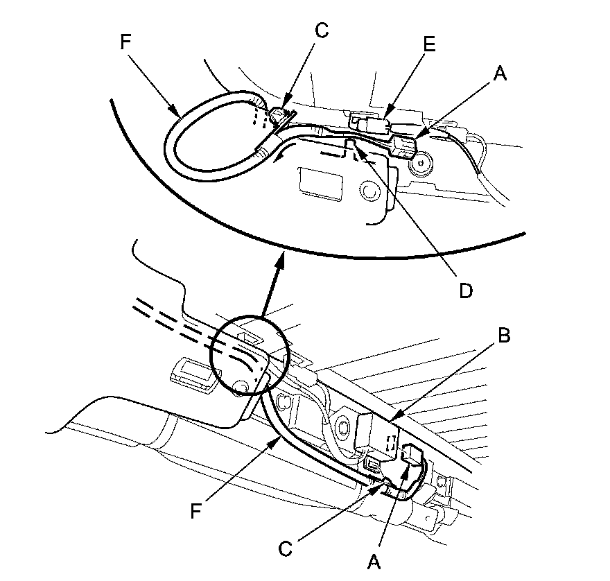 13. 2-door: From the right C-pillar area, disconnect the antenna lead connector (A) from the AM/FM antenna amplifier (B), and detach the harness clip (C). Pass the harness clip and the connector through the gap between the projection (D) of the side curtain airbag bracket and the glass antenna connector (E) by pulling the antenna lead (F) to the headliner side.