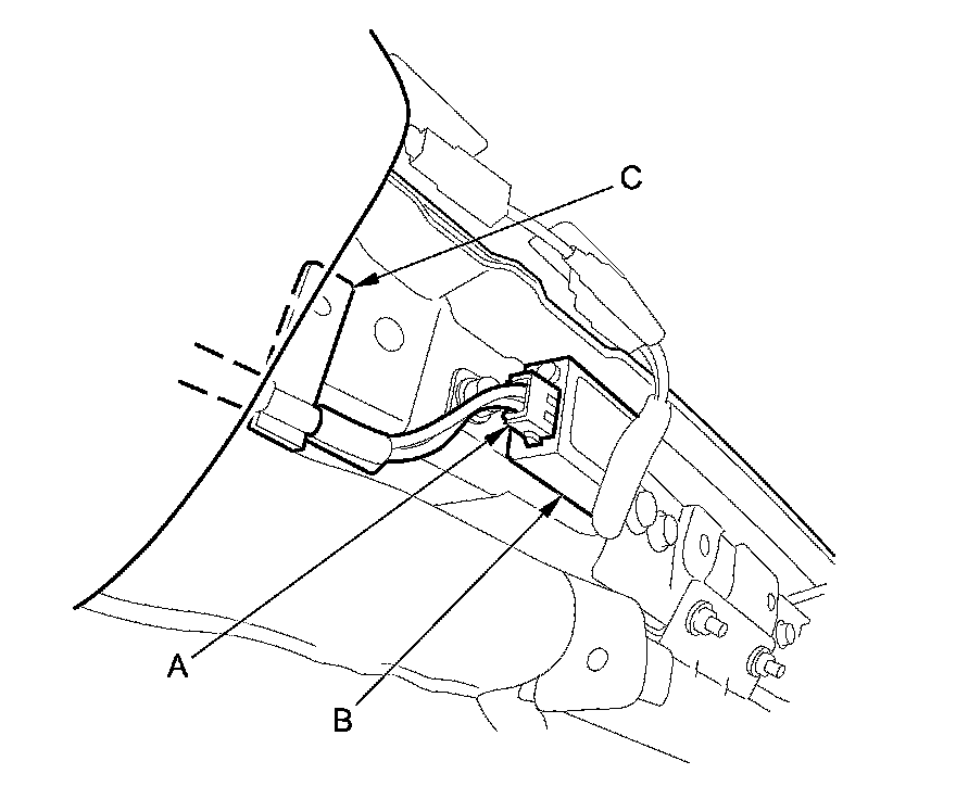 11. From under the driver's dash, disconnect the roof wire harness connector(s) (A), and detach the harness clip (B) and the harness holder (C).