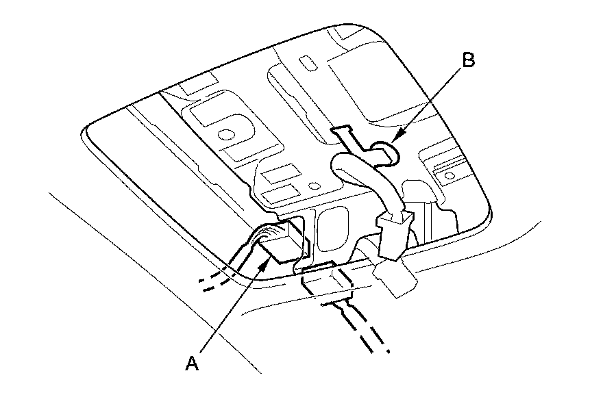 15. For some models: From the roof console opening, disconnect the moonroof subharness connector (A), and detach the harness clip (B).