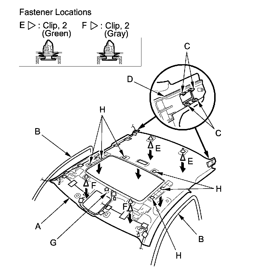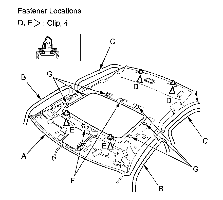 3. With the help of an assistant, detach the rear clips (E) by pulling down the rear area of the headliner.