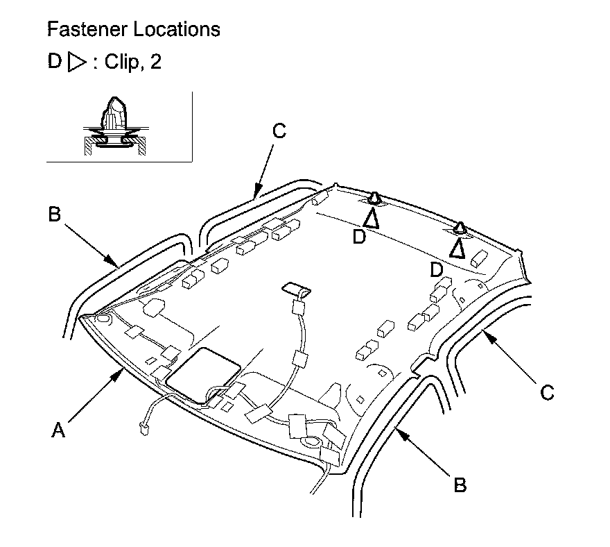 2. With the help of an assistant, detach the rear clips (D) by pulling down the rear area of the headliner.