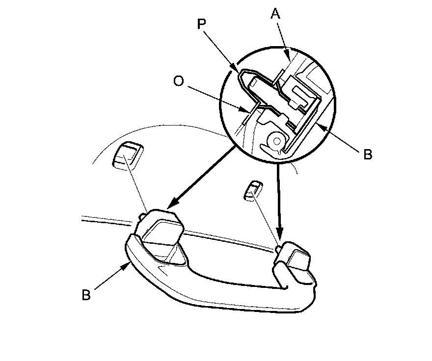 - When installing the grab handle, push on the handle against the bracket (O) until the clips (P) snap into place securely.