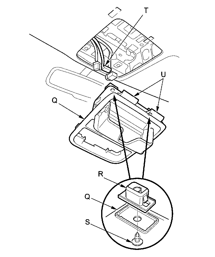 - Install the roof console screw grommets (R) on the console with the screws (S).