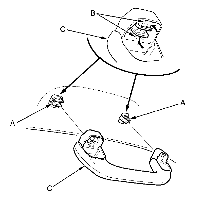 8. Position the grab handle (A) on the grab handle bracket (B), and push on the grab handle until the clips (C) snap into place securely.
