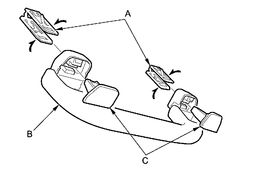 7. Install the clips (A) on the grab handle (B), then insert the caps (C) fully into the clips.
