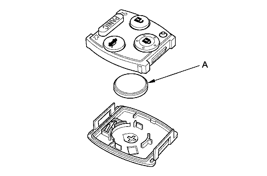 4. Replace the transmitter battery (A) with a new one (CR1616), and try to lock and unlock the doors with the transmitter by pressing the lock or unlock button five or six times.