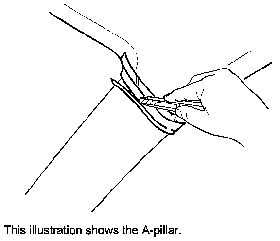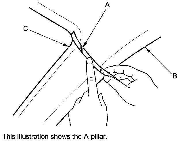 2. Apply masking tape (A) to the headliner (B) to mark the upper edge of pillar trim (C).