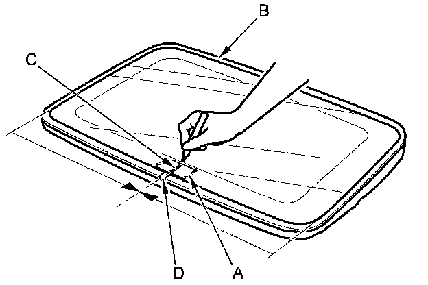 2. Place a piece of masking tape (A) on the middle of the front edge of the moonroof glass (B). Make sure the tape is on the glass only, and is not touching the weatherstrip.