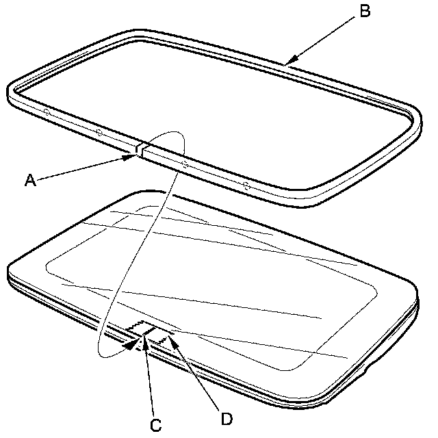 8. At the rear of the moonroof glass, continue pressing from one corner to the middle; then press from the opposite corner to the middle until the weatherstrip is completely installed.