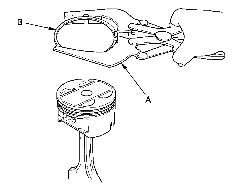 2. Using a ring expander (A), remove the old piston rings (B).