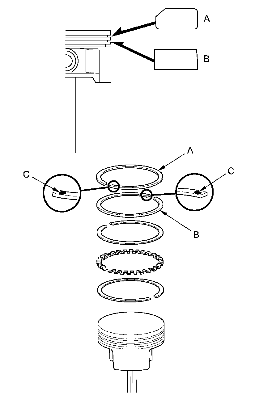 6. Install the rings as shown. The top ring (A) has a 1D mark and the second ring (B) has a 2X mark. The manufacturing marks (C) must be facing upward.