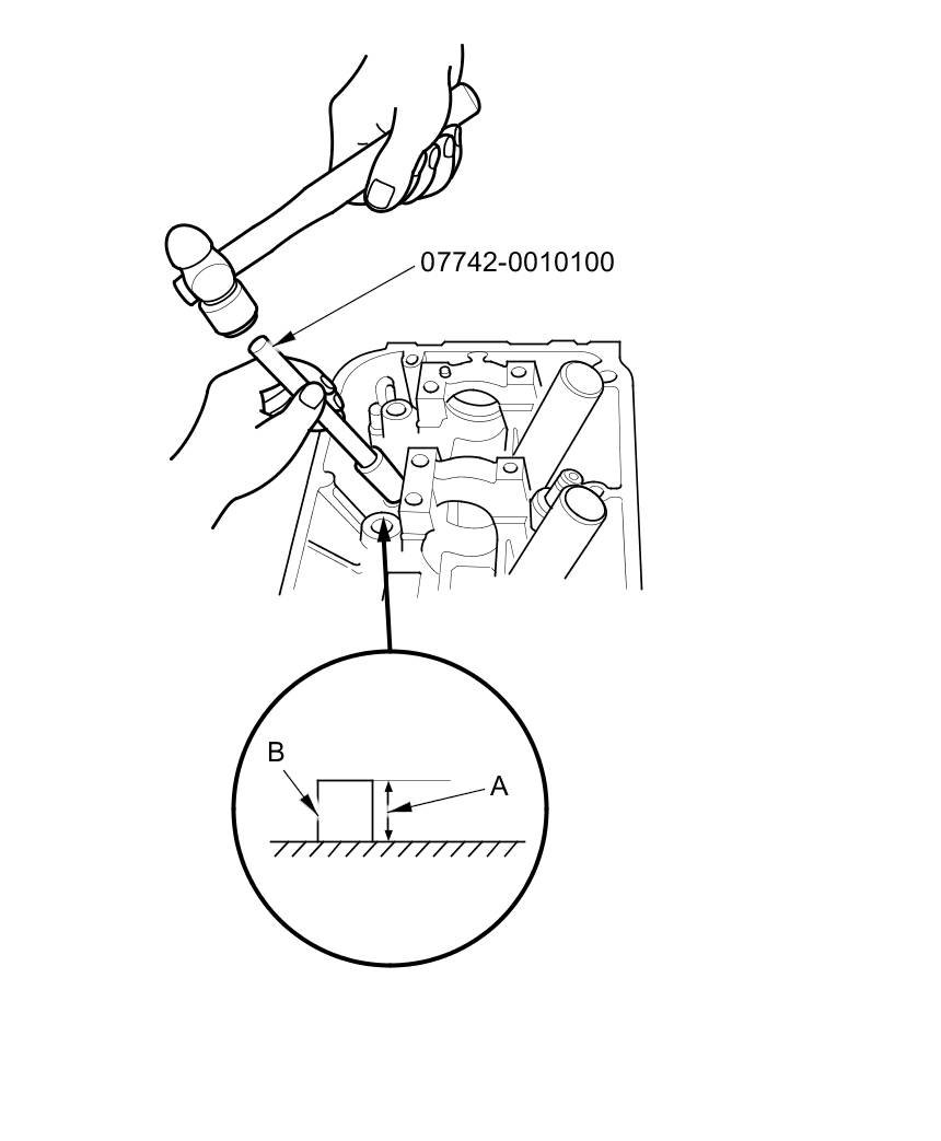 9. Apply a thin coat of new engine oil to the outside of the new valve guide. Install the guide from the camshaft side of the head; use the valve guide driver to drive the guide to the specified installed height (A) of the guide (B). If you have all 12 guides to do, you may have to reheat the head.