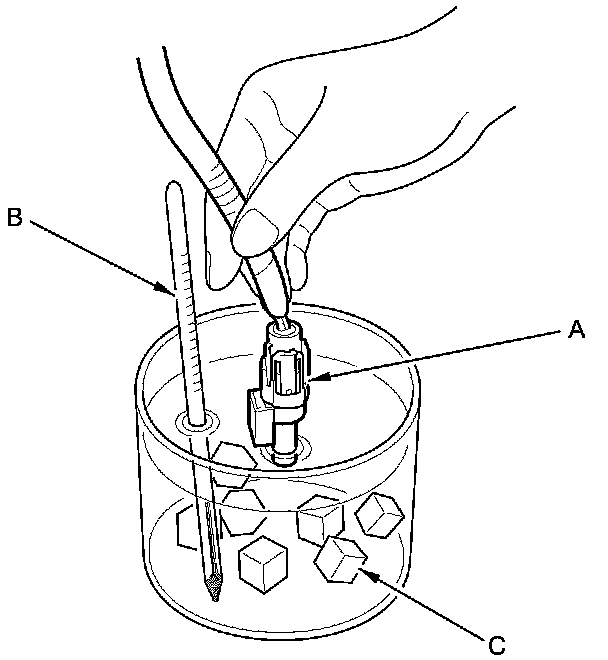 NOTE: To recalibrate the display to the true temperature, remove the outside air temperature sensor (A), but leave it connected. Submerge the sensor and a thermometer (B) in a container of ice water (C). Select the calibration mode as described above, then recalibrate the display to the true temperature.